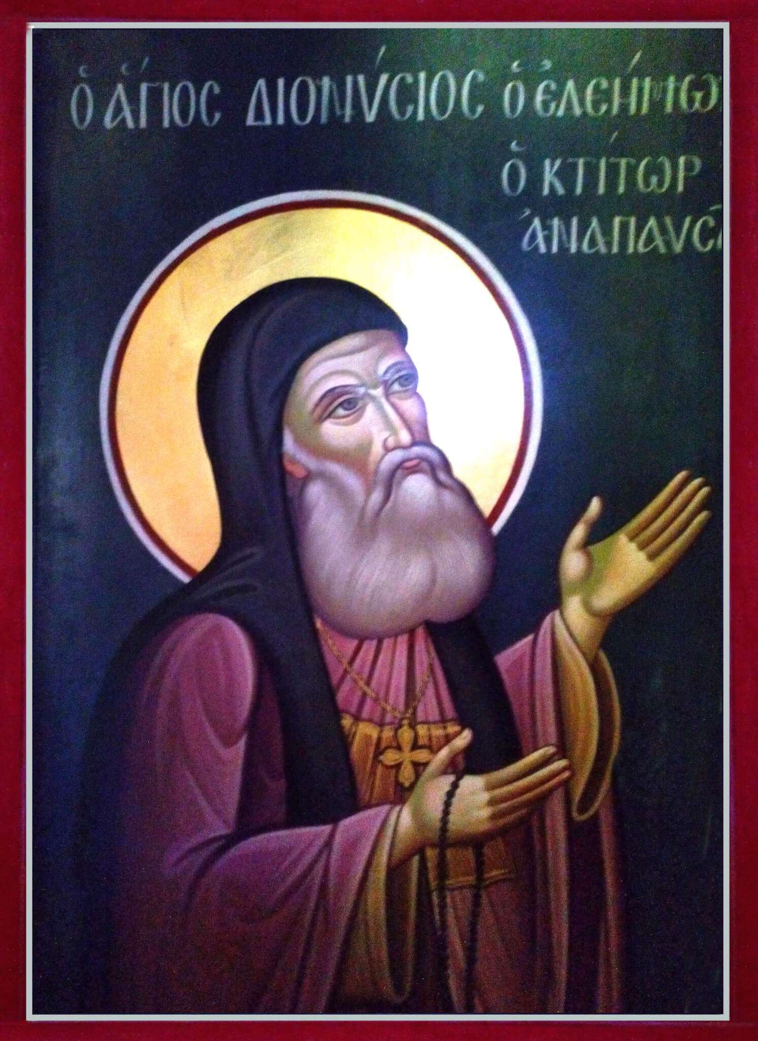 (Τοιχογραφία του καθολικού της Ιεράς Μονής Αγίου Νικολάου Αναπαυσά. Ο κτήτωρ άγιος Διονύσιος Λαρίσης ο Ελεήμων)