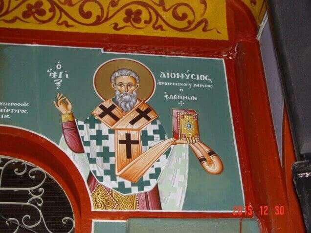 Η επιγραφή της τοιχογραφίας (ο Άγιος Διονύσιος ο Ελεήμων Αρχιεπίσκοπος Λαρίσης), μαρτυρεί ότι ο Άγιος καταξιώθηκε στη συνείδηση του