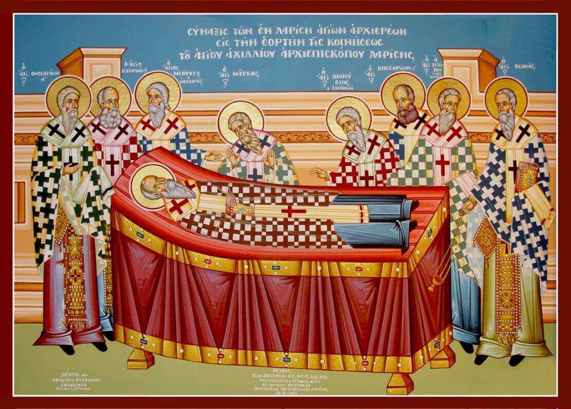 Τέλος εικονίζεται και σε τοιχογραφία του 2015 μ.Χ. στο δεξιό κλίτος της λιτής του Ιερού Ενοριακού μας Ναού Μεγαλομάρτυρος Αγίου Γεωργίου, όπου τοιχογραφείται η ΣΥΝΑΞΙΣ ΤΩΝ ΕΝ ΛΑΡΙΣΗ ΑΓΙΩΝ ΙΕΡΑΡΧΩΝ ΚΑΤΑ ΤΗΝ ΕΟΡΤΗ ΤΗΣ ΚΟΙΜΗΣΕΩΣ ΤΟΥ ΑΓΙΟΥ ΑΧΙΛΛΙΟΥ ΑΡΧΙΕΠΙΣΚΟΠΟΥ ΛΑΡΙΣΗΣ.